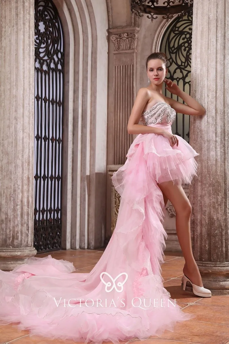 Unique Ruffled Pink Tulle Beaded High-low Prom Gown