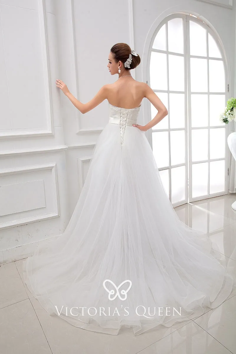White Satin, Lace and Tulle Overskirt Informal Wedding Dress