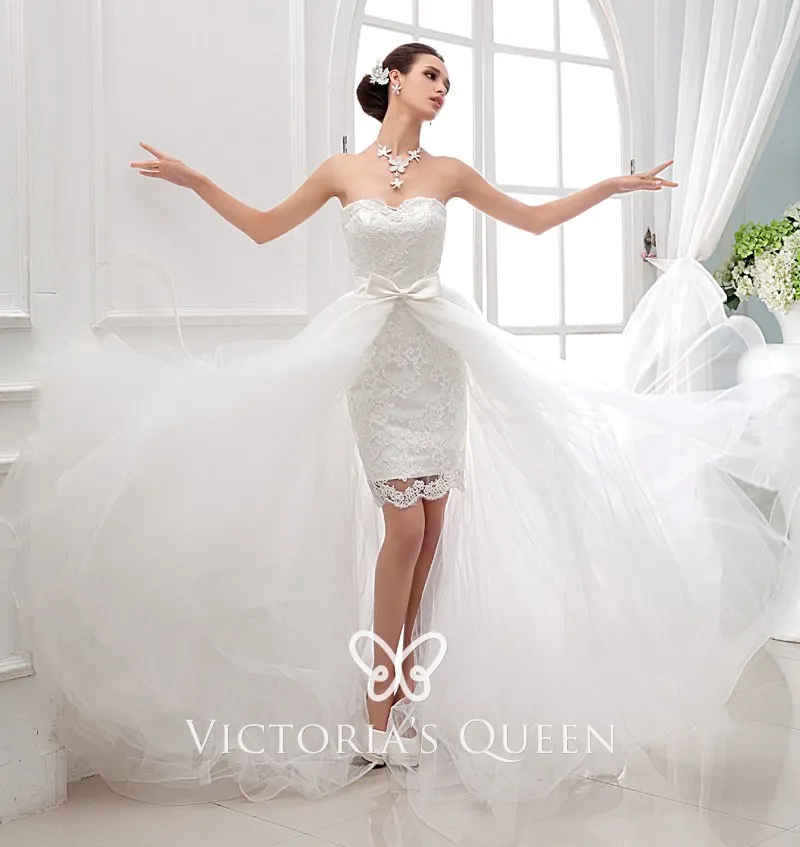 White satin, lace, and tulle overskirt informal spring/summer/fall informal wedding dress. Strapless sweetheart lace overlay sheath short dress with floor-length white tulle skirt.