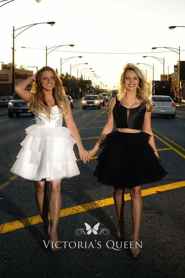 This chic short white & black cocktail or homecoming party dress features a feminine scoop neckline, an alluring illusion V-cut, a sleeveless satin bodice, and a cute layered tulle skirt. Be prepared to be the eye-catcher in this cocktail dress.
