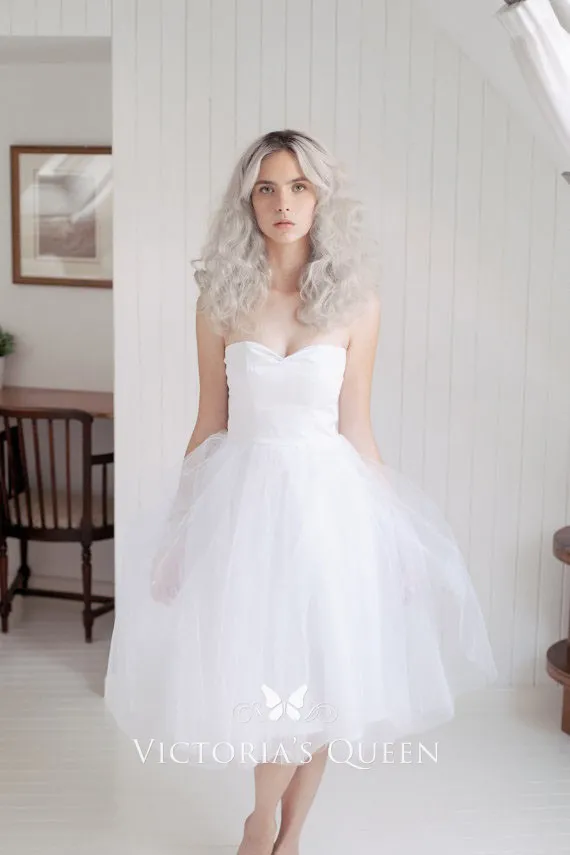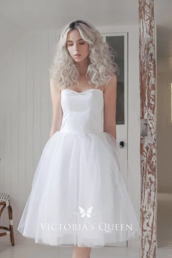 Strapless short white informal spring/summer bridal dress. Strapless satin bodice with curved neckline, simple layered tulle skirt with knee-length silhouette.
