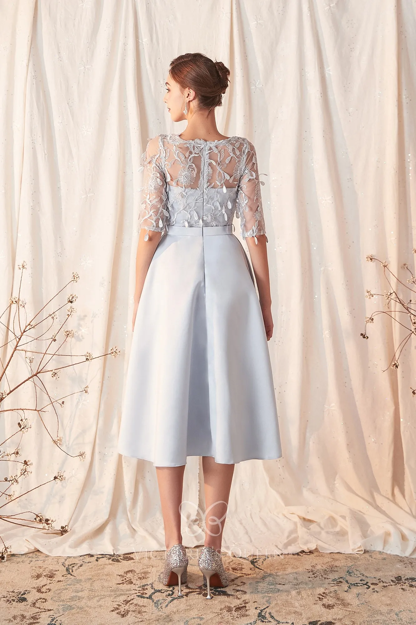 Modern silver lace and satin A-line tea-length wedding guest, anniversary, or mother-of-the-bride dress with satin jacket, featuring illusion neckline and half sleeves, removable three-quarter sleeve jacket, closed back.