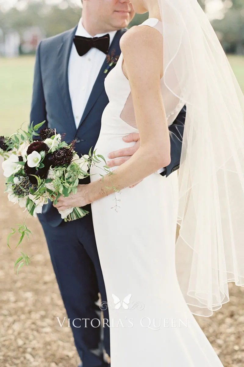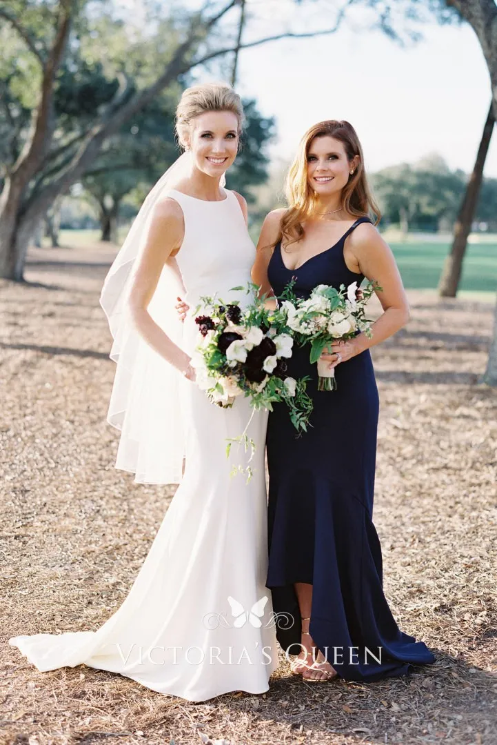 This modest sleeveless ivory long spring/summer/fall wedding dress features an elegant boat neckline, the figure-flattering silhouette of a mermaid, and an alluring illusion back adorned with classic button closure.