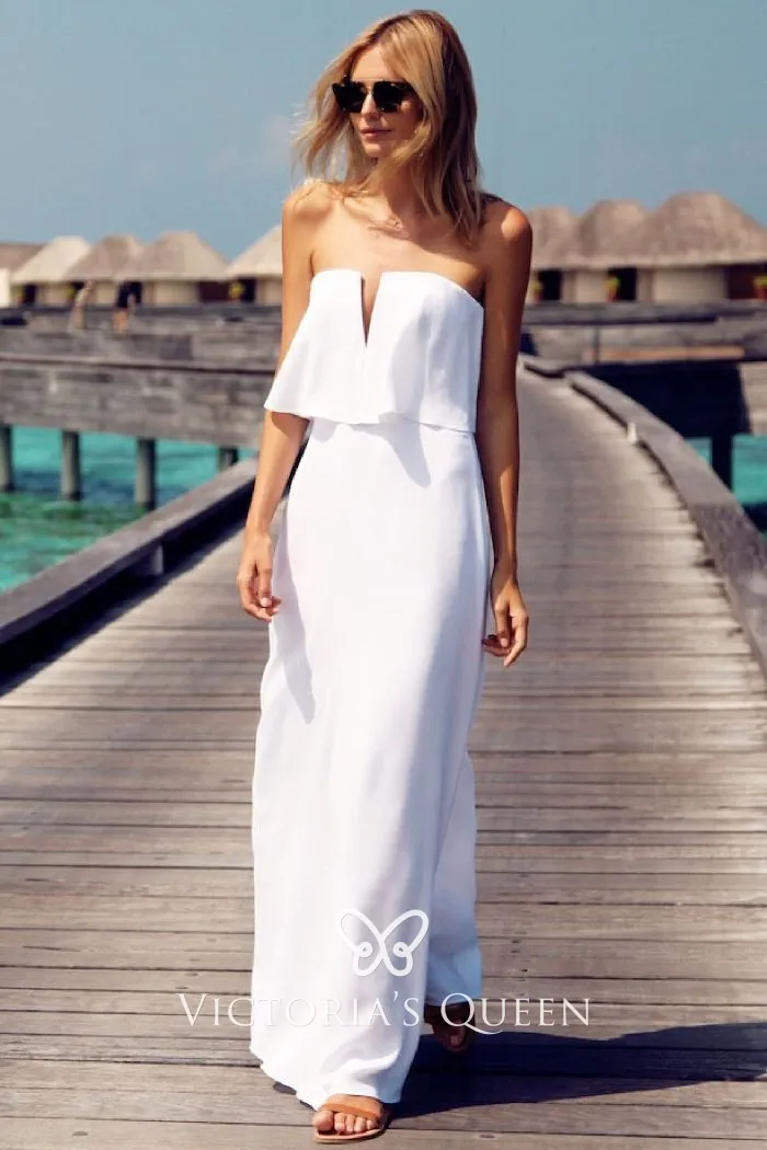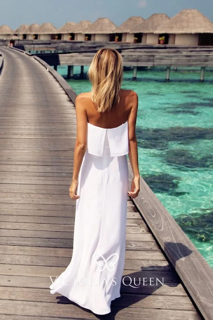 Strapless V-cut Chiffon Sheath Long Beach Bridal Dress