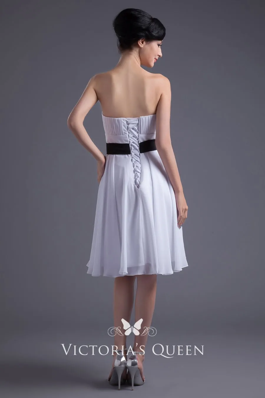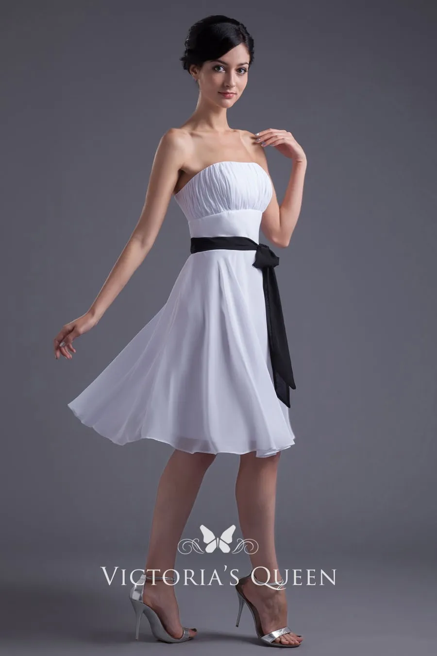 This pure white cocktail, homecoming, or bridesmaid dress finished with strapless ruched bodice on the top of a-line chiffon skirt. Knee length short gown with sash.