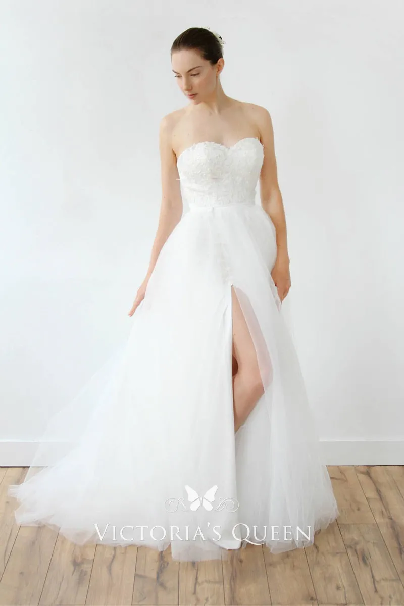 Featuring a simple strapless bodice with a sweetheart neckline, airy white tulle skirt just touching the floor, timeless A-line silhouette, and bold design of side slit, this floor-length spring/summer/fall wedding dress will make you the eye-catcher.