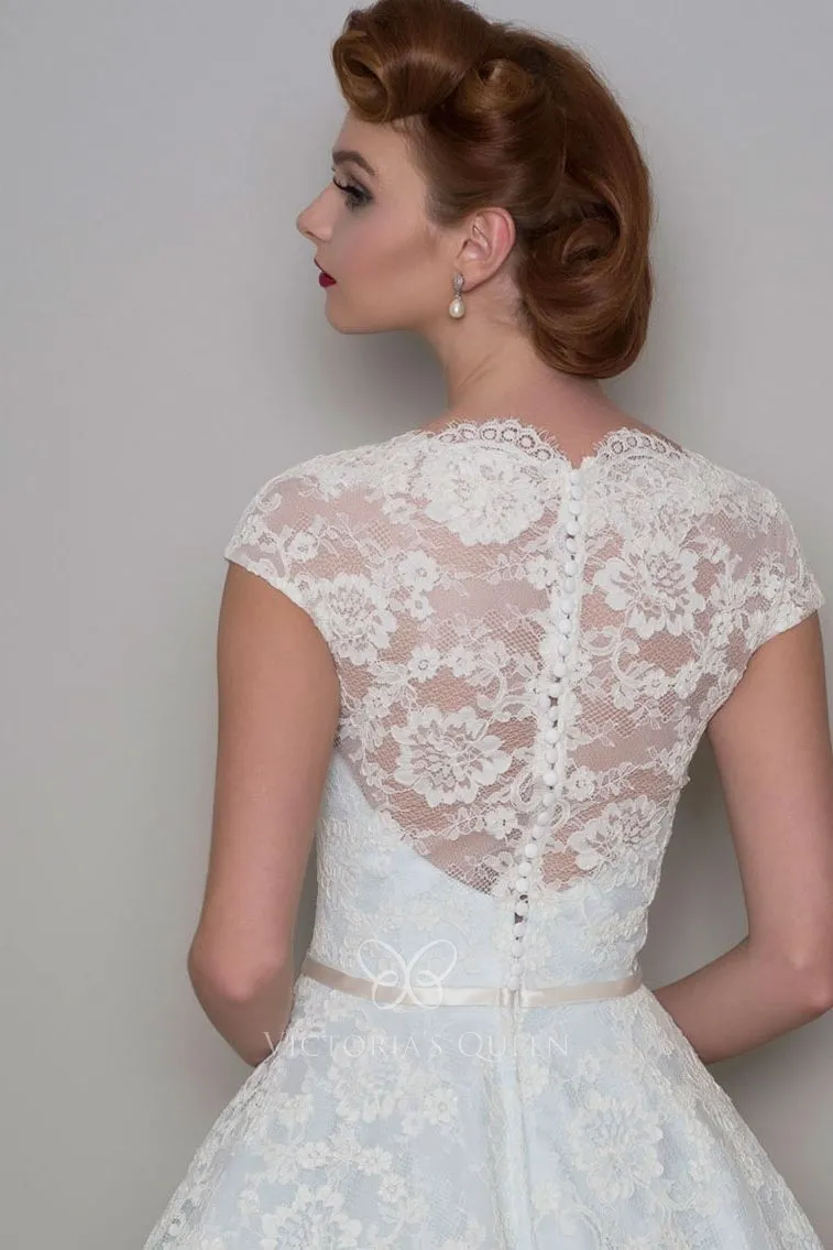 Cute & retro A-line tea-length spring/summer/fall bridal gown with cap sleeves and ivory corded lace overlay on the pale blue skirt, trimmed with a narrow satin bow belt. Illusion lace with button-up back.