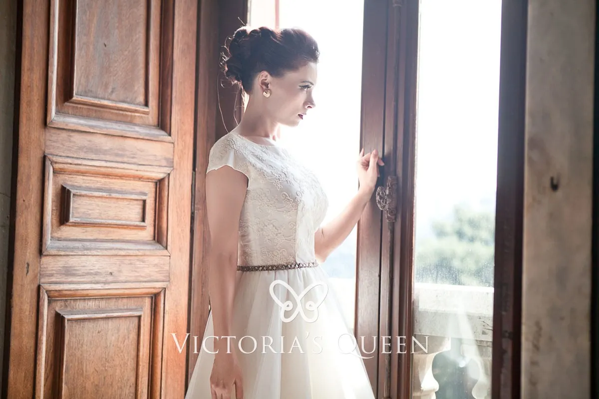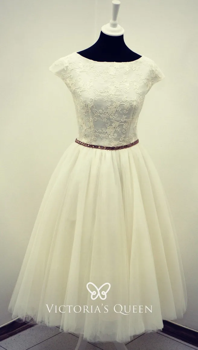 Tea-length Lace and Tulle Cute Cap Sleeve Wedding Dress