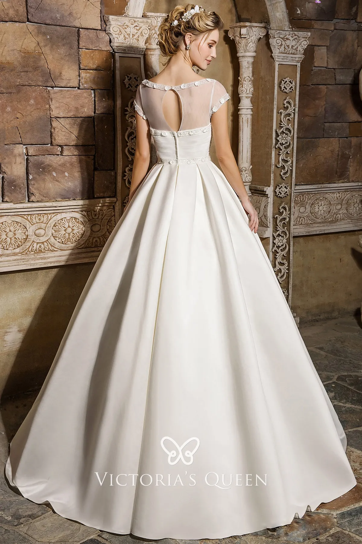Stylish illusion neck, sheer short sleeve, 3D flower embellishment at the waist and the bodice, ivory pleated satin skirt floor-length ball gown spring/fall/winter modern wedding dress, sheer back with keyhole details, no train.
