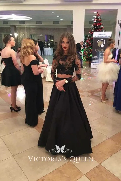 Two-piece Black Illusion Long Sleeve Pretty Prom Dress