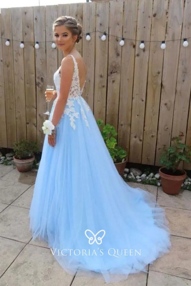 Princess white lace appliqued plunging V-neckline sky blue tulle floor-length A-line long formal dress for prom, birthday party, and wedding guest. Low V back. Lace shoulder straps and sleeveless.
