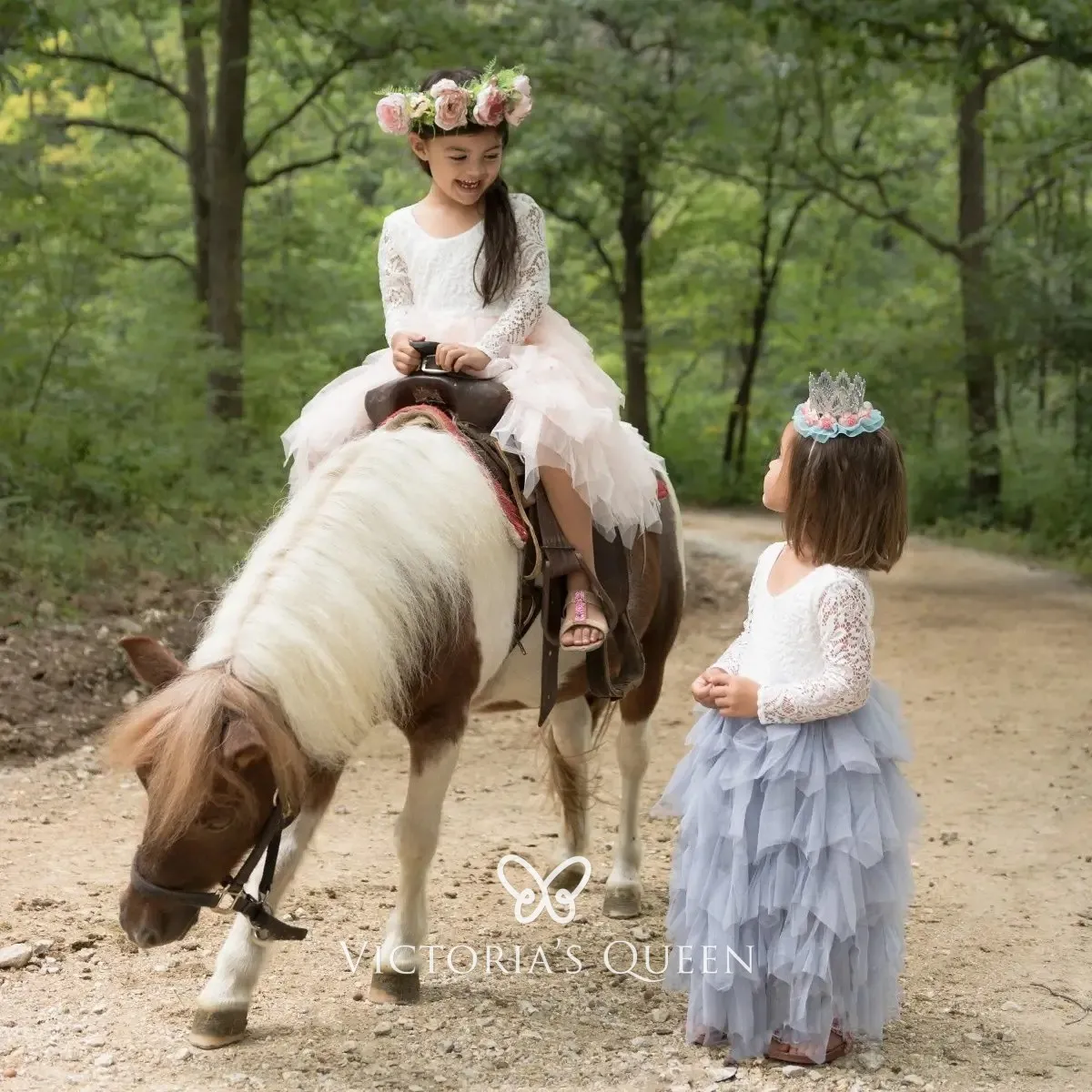 White lace and tiered ruffle tulle skirt two-tone long flower girl dresses for wedding. Scoop neckline, long sleeves.