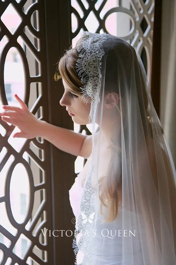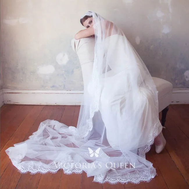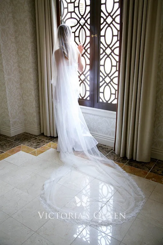 This white cathedral length veil features exquisite lace edge with eyelash detail. Single-tier veil compliments an array of wedding gown styles.