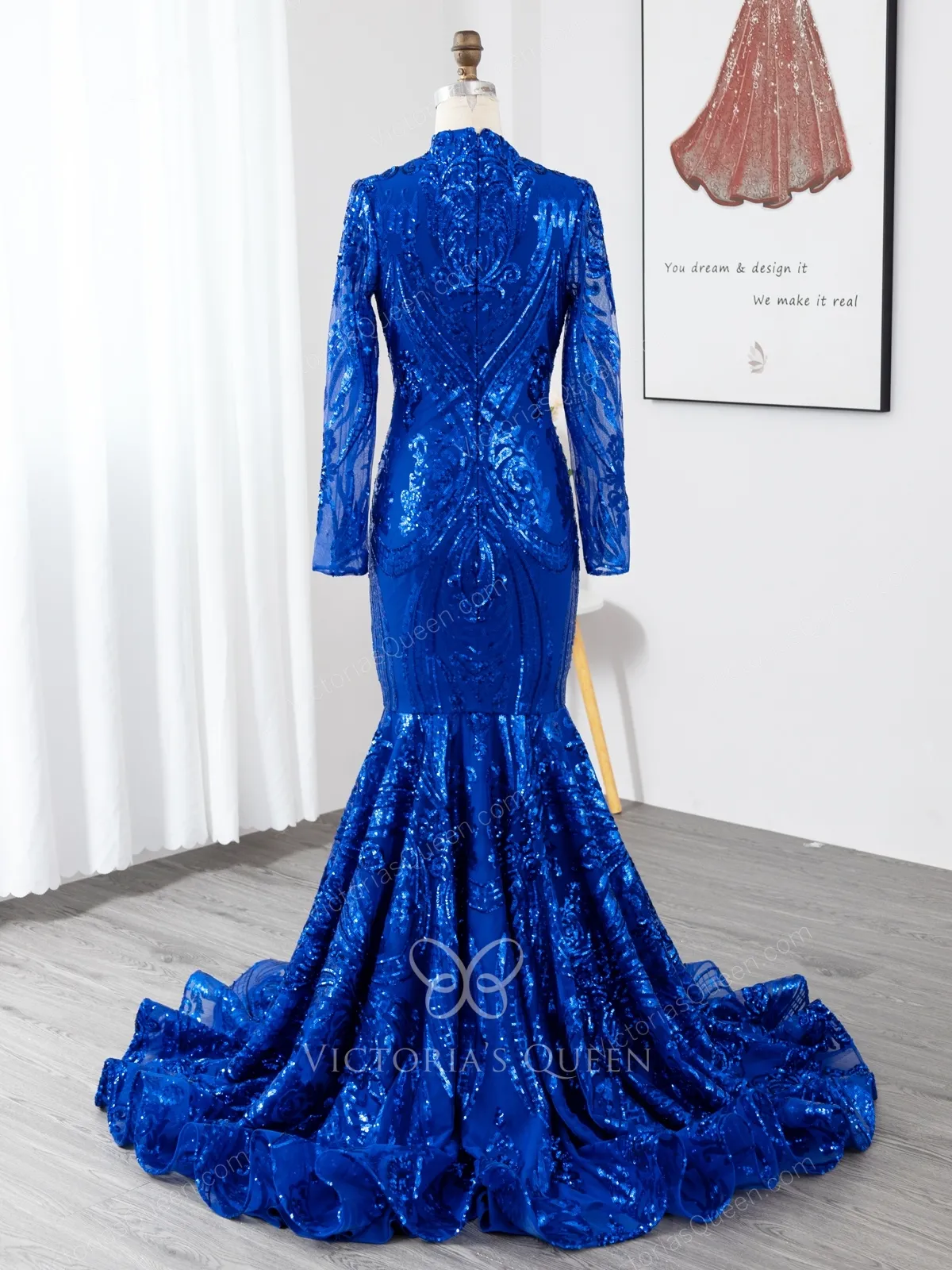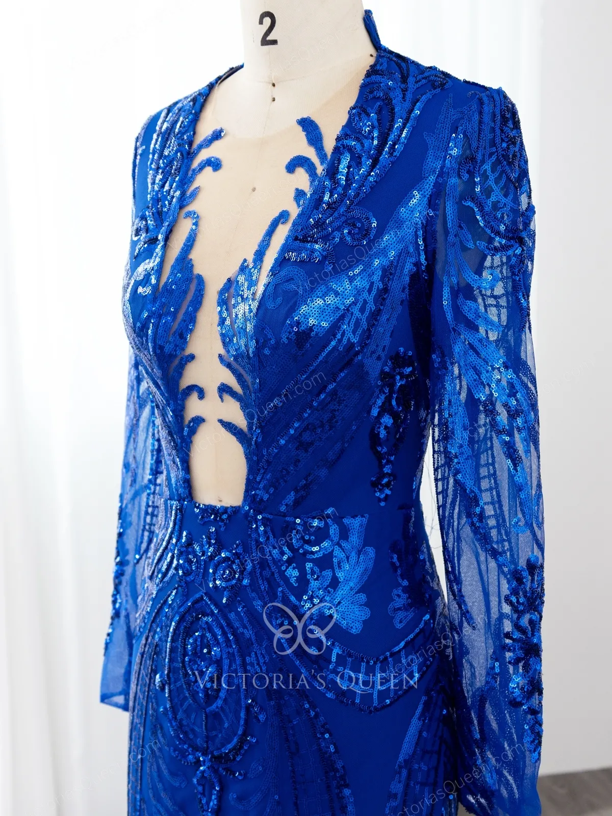 This uniquely abstract pattern royal blue sequin mermaid sparkly prom evening dress features an illusion plunging neckline with a trimmed hem open bodice, sheer long sleeves, and a floor-length fitted silhouette with a flounced train.