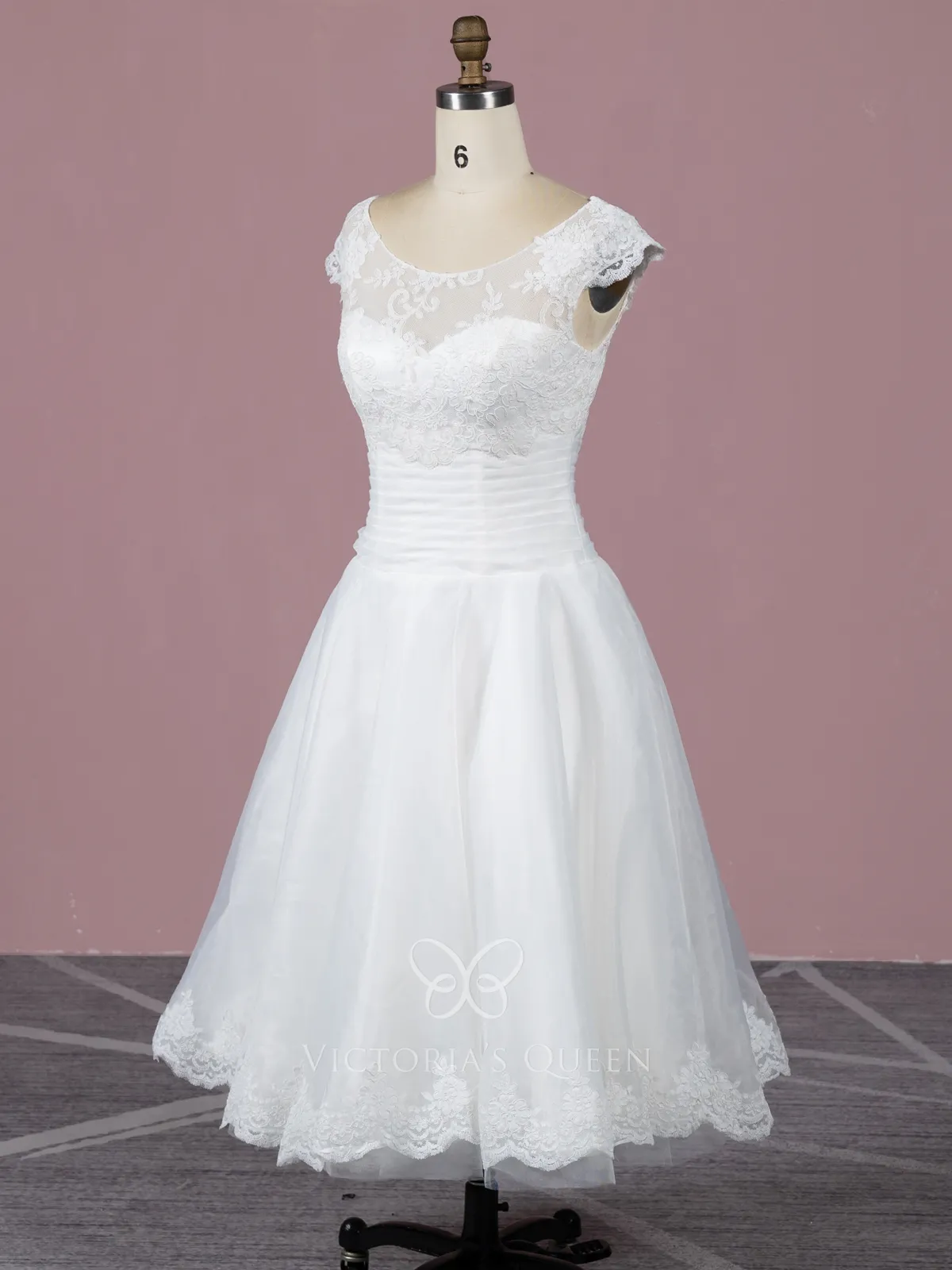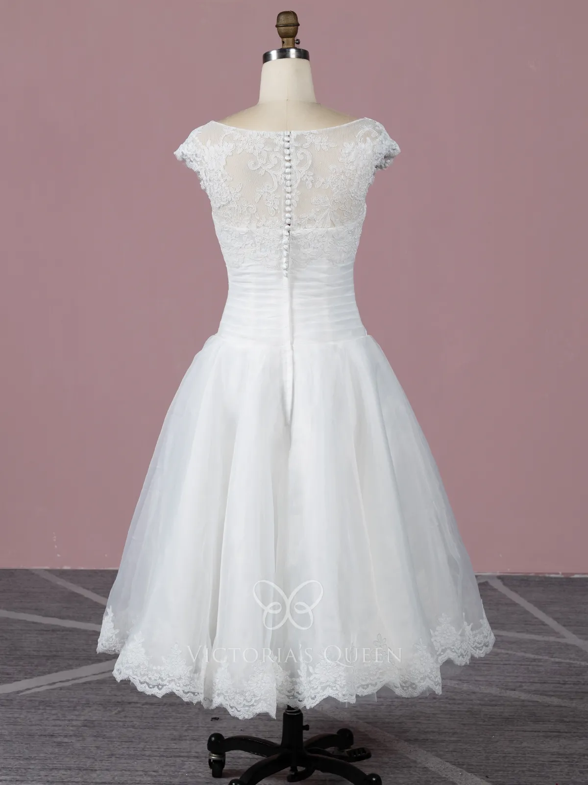 Illusion Cap Sleeve Classic Tea Length Ivory Lace and tulle Wedding Dress
