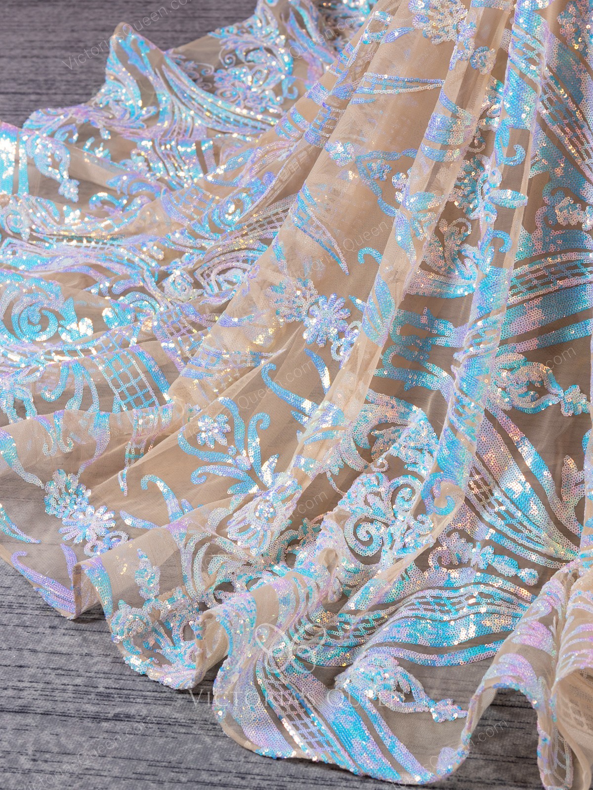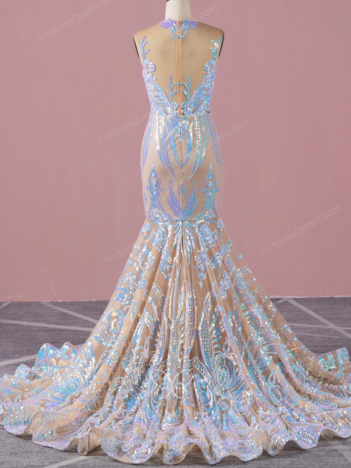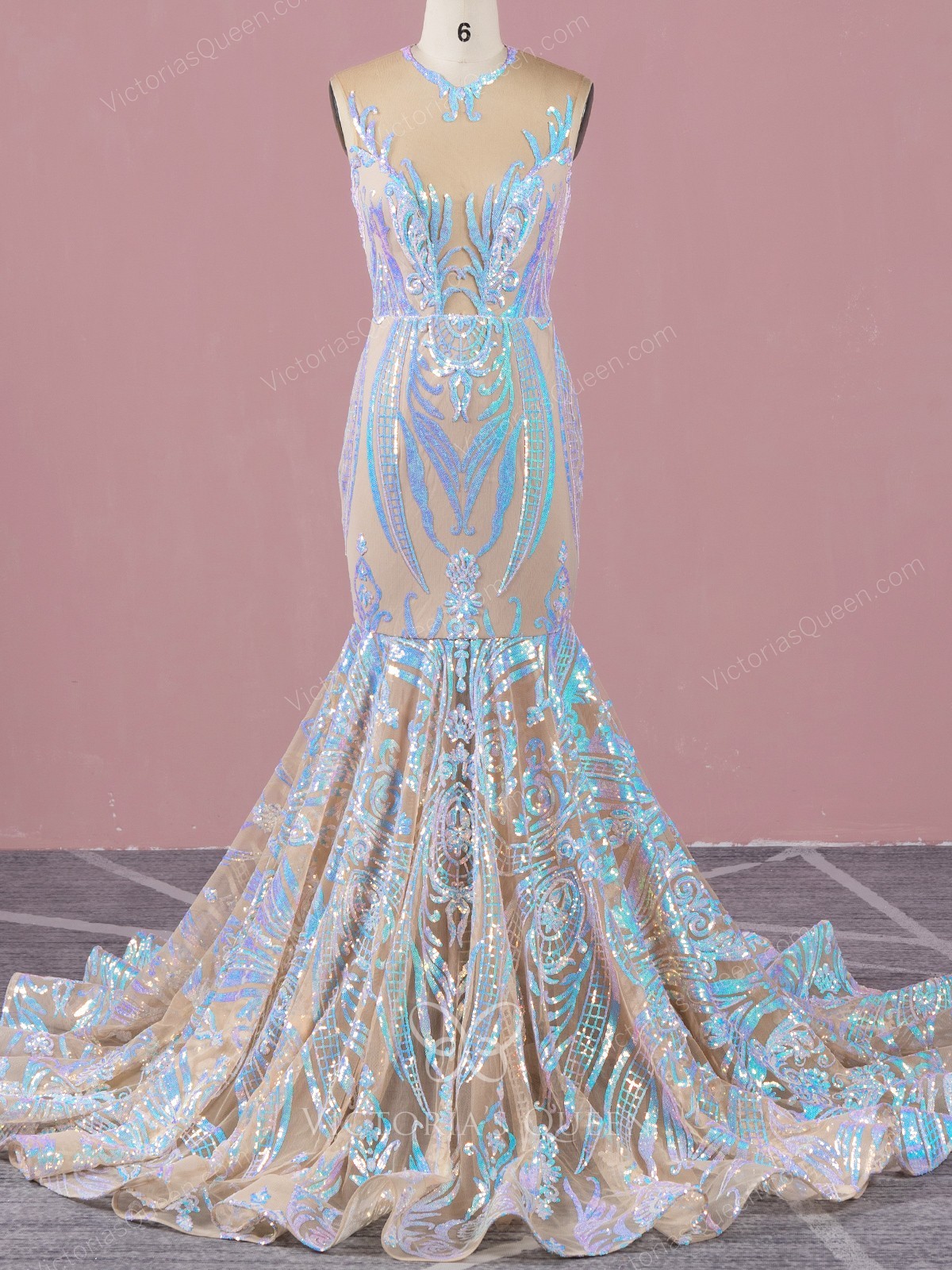 • [18085] Sparkly Iridescent Sequin Nude Mesh Trumpet Prom Dress