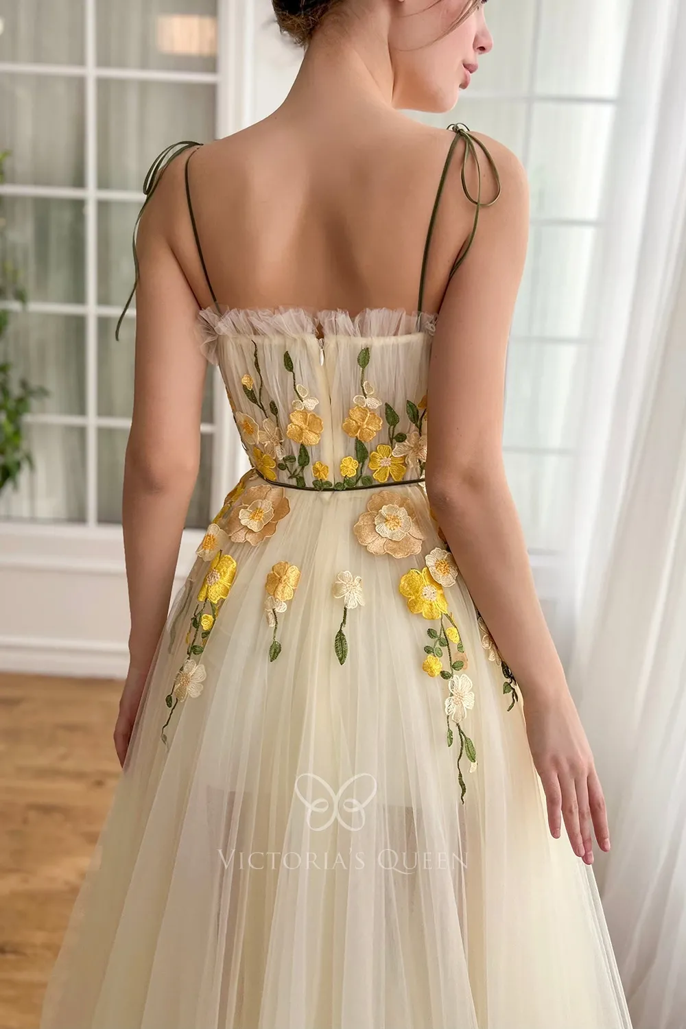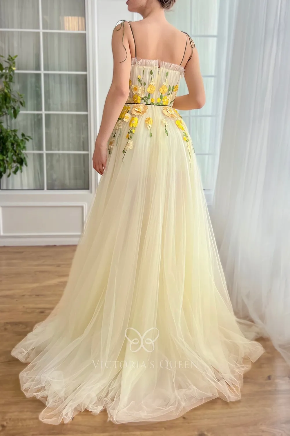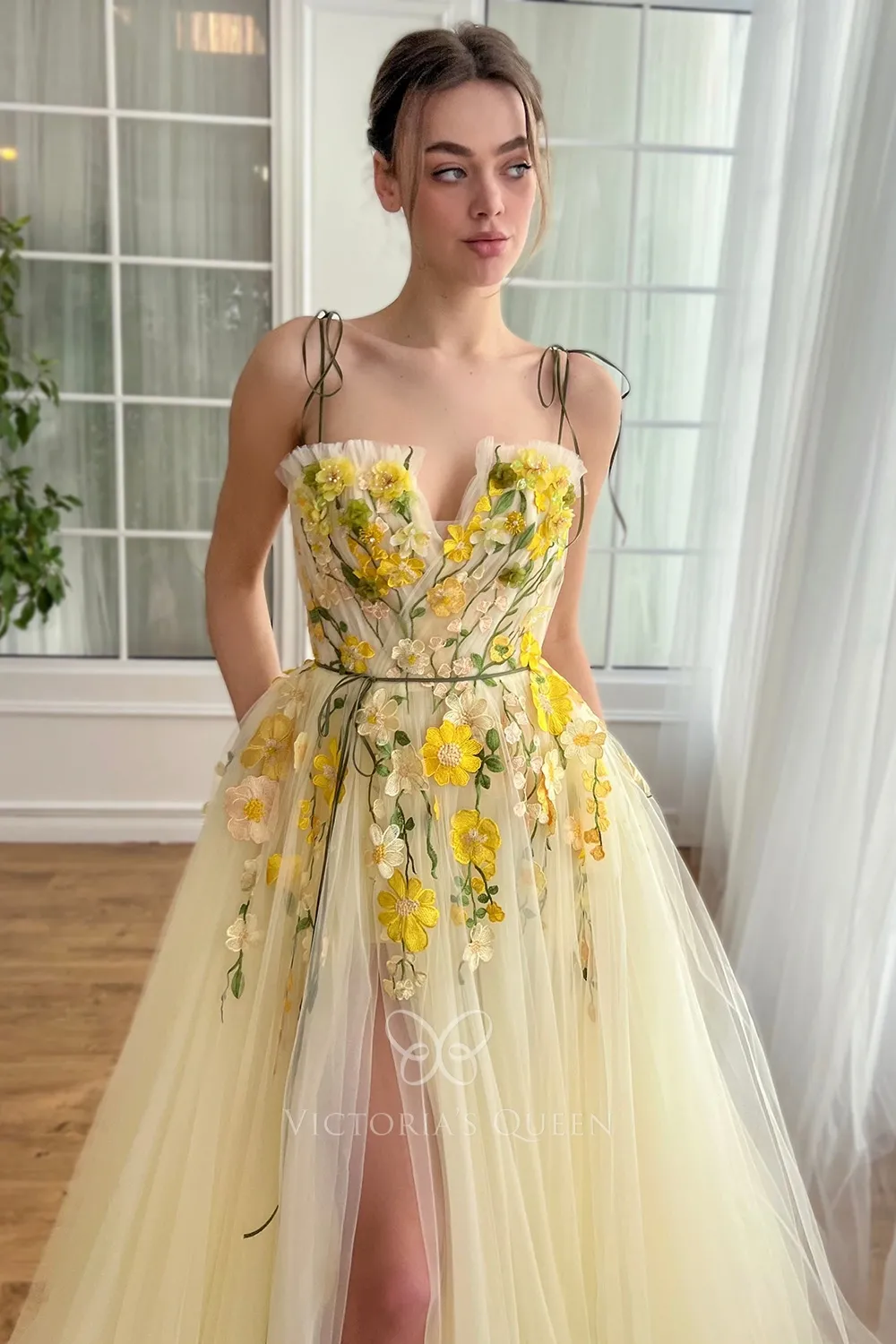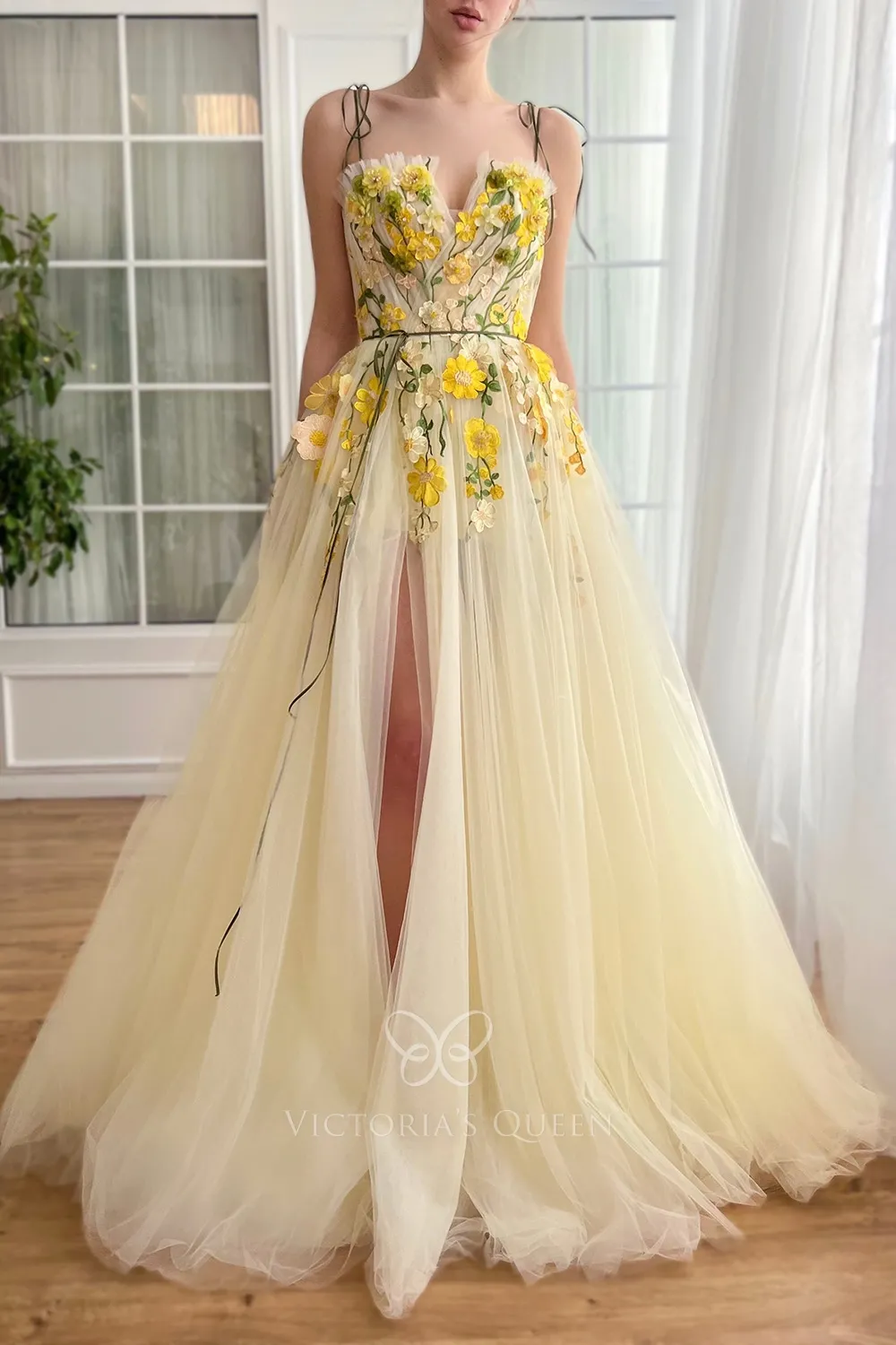Romantic Spaghetti Straps Yellow Floral Lace Slit Prom Dress